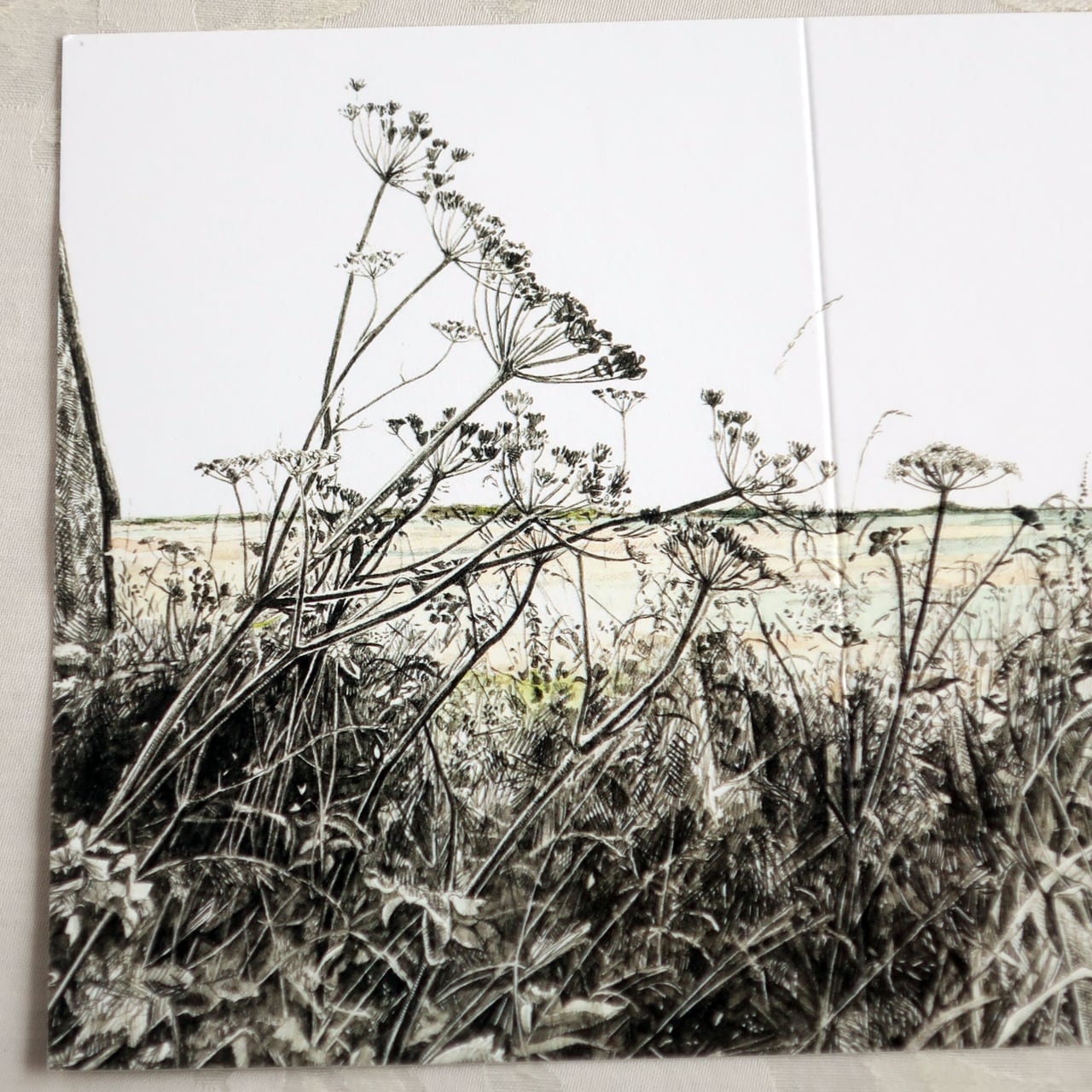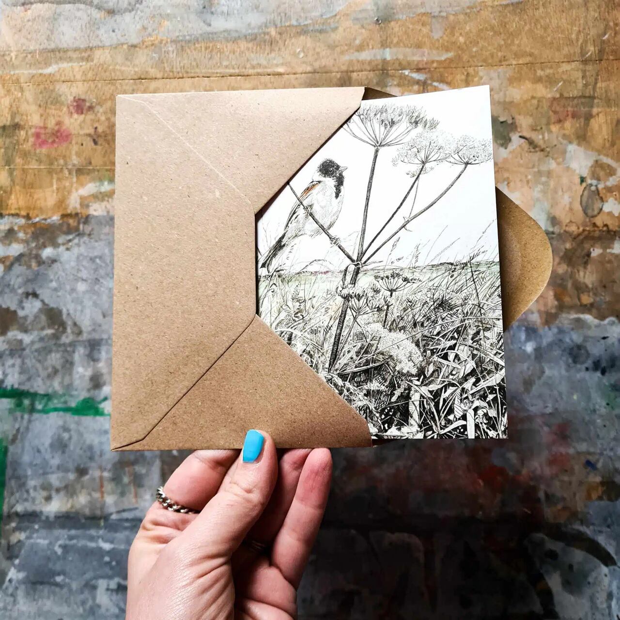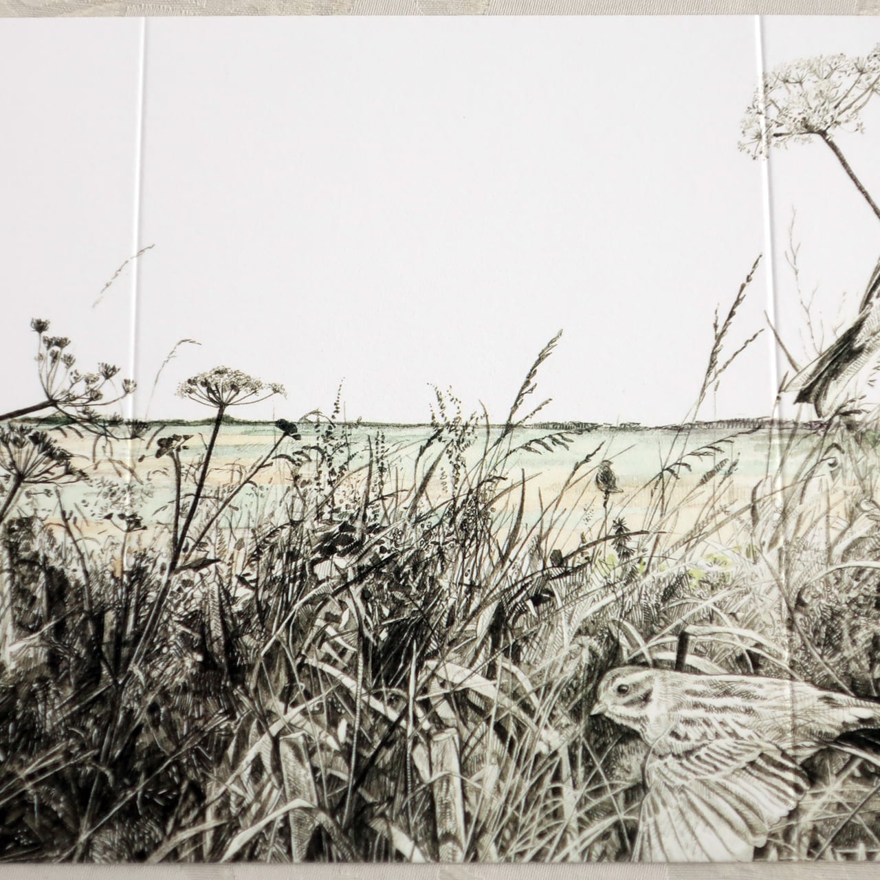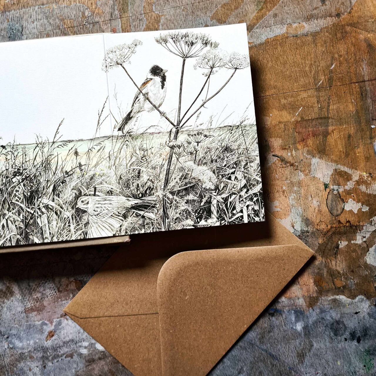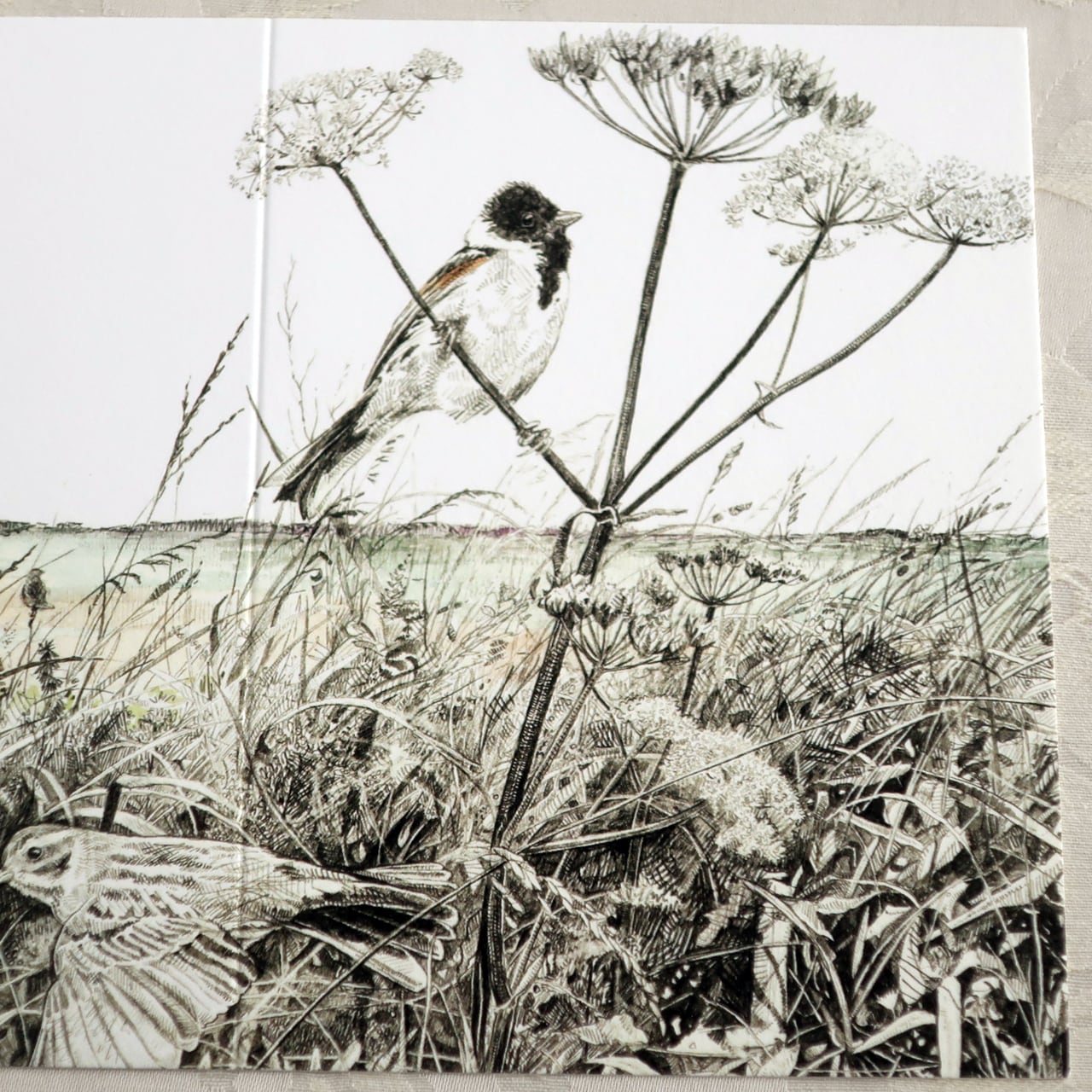 海岸のこみち オオジュリンとワイルドフラワーとホグウィ―ドの花 夏 グリーティングカード (メール便可)
