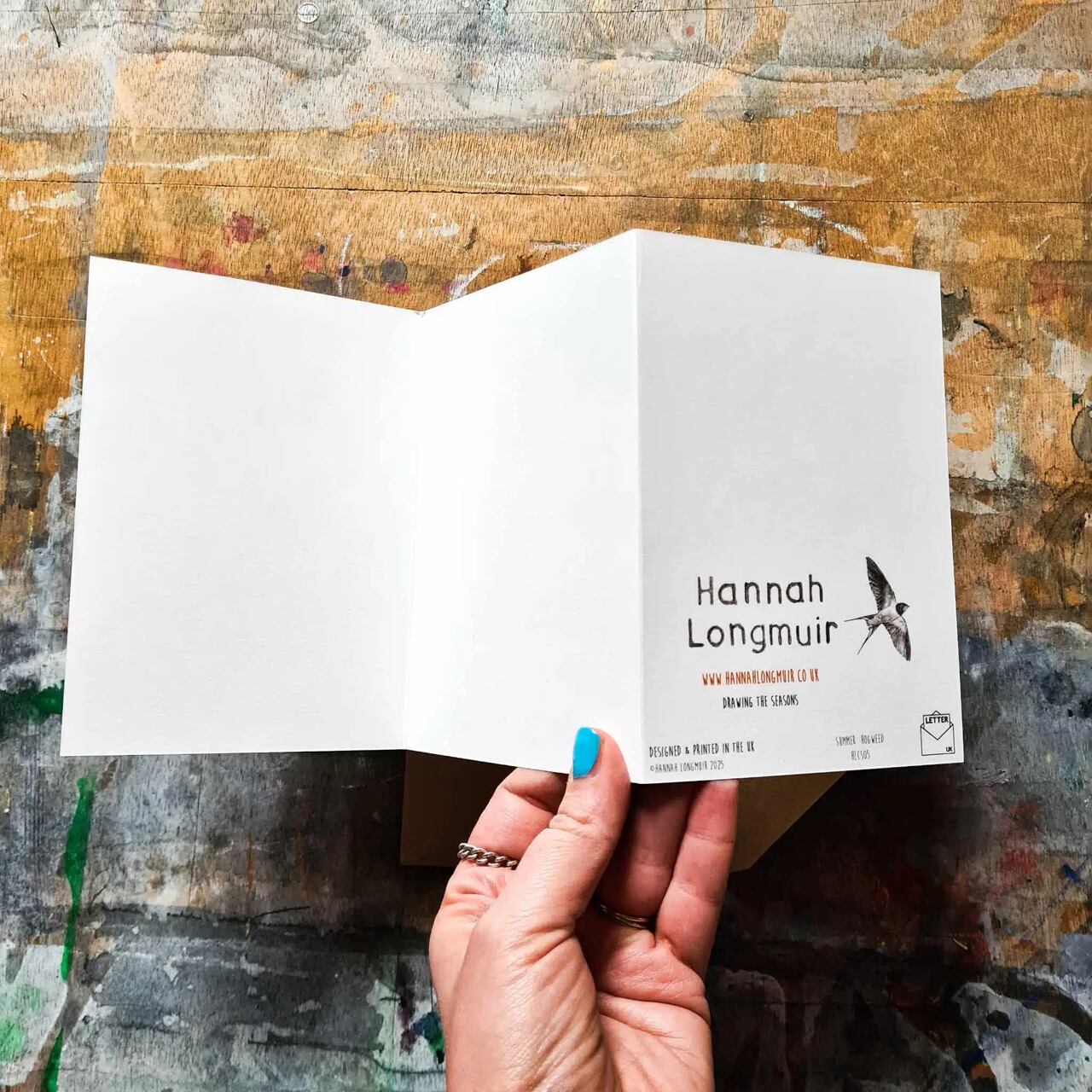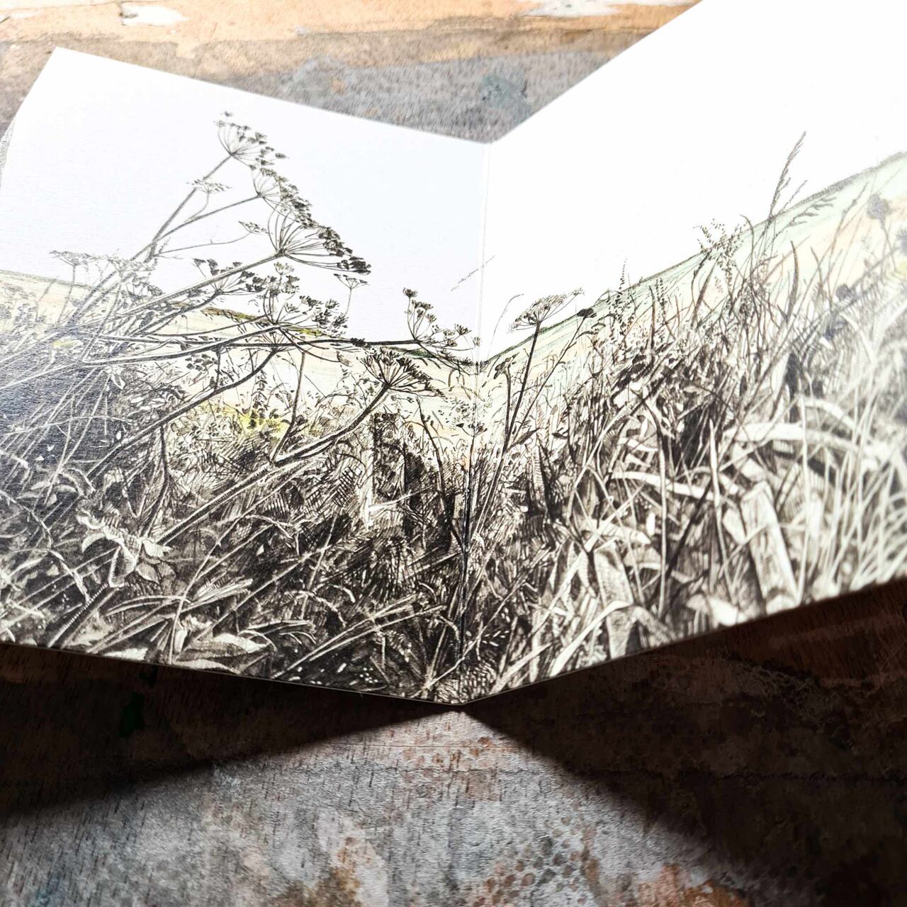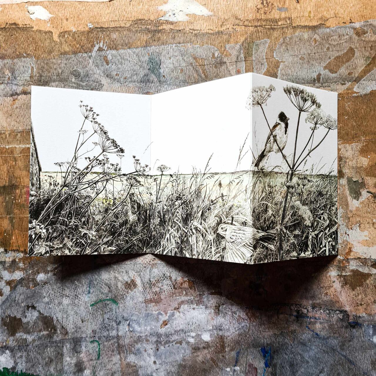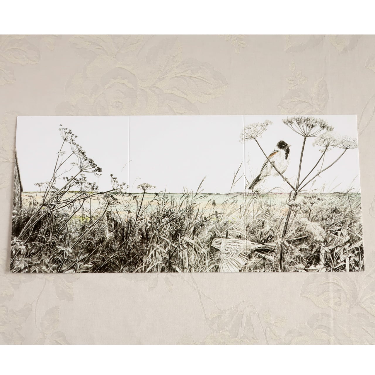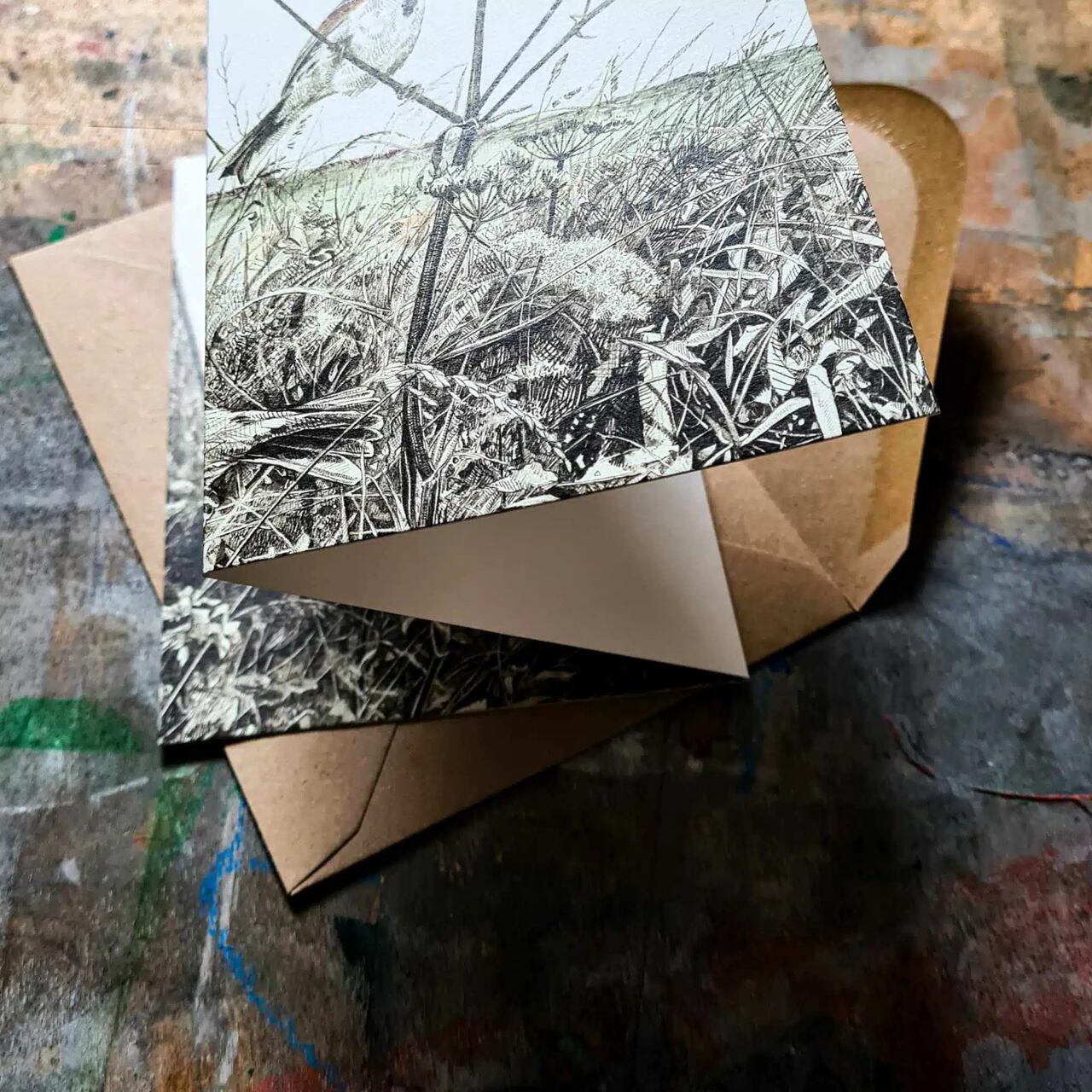 海岸のこみち オオジュリンとワイルドフラワーとホグウィ―ドの花 夏 グリーティングカード (メール便可)