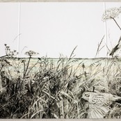海岸のこみち ― 夏真っ盛りにホグウィ―ドやたくさんのワイルドフラワーが、砂地の丘や道端に咲き、オオジュリンがポーズをとって羽を休めるスポットでもある。
