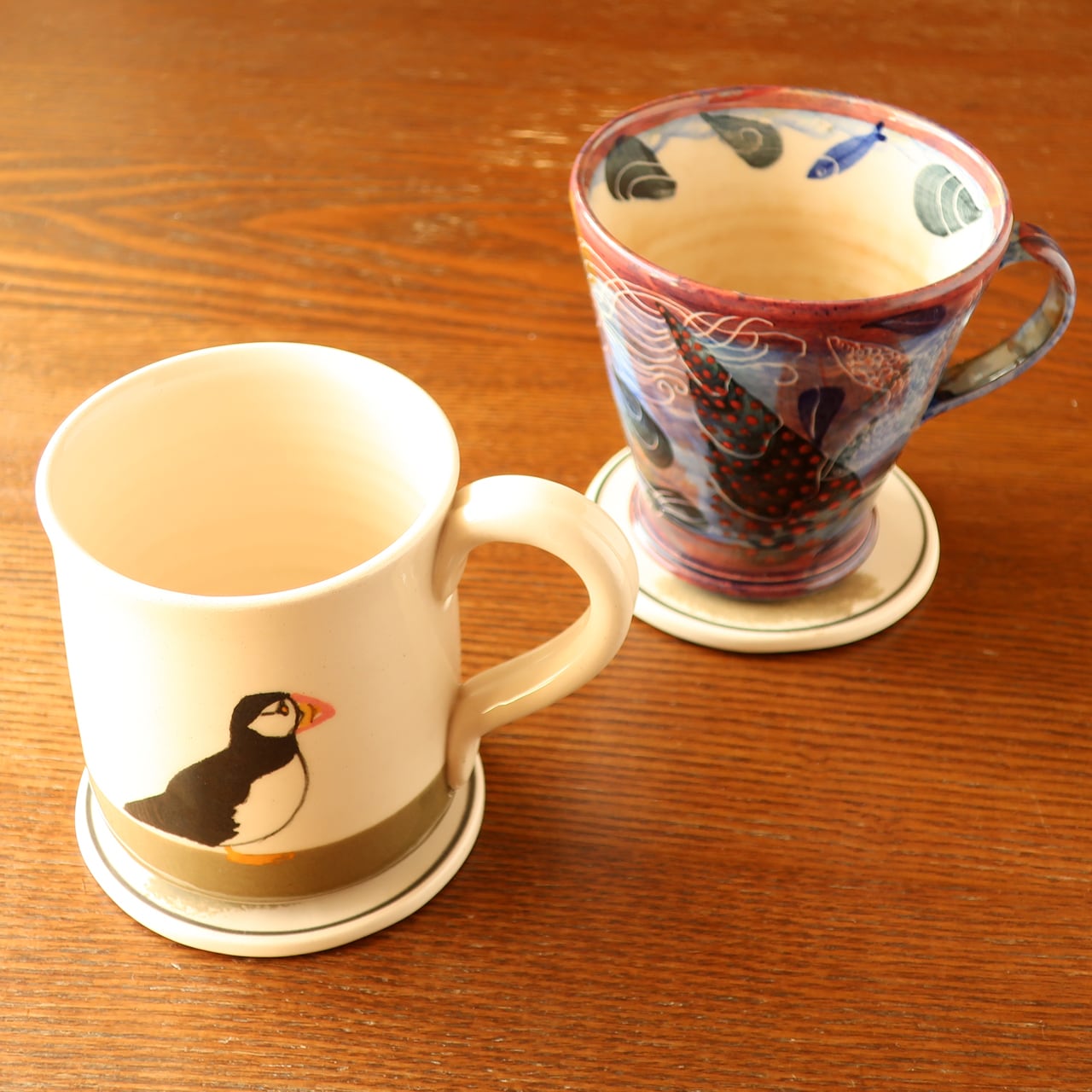 コースターは、マグカップやコーヒーカップ、グラスなどいろいろなカップに似合います。
